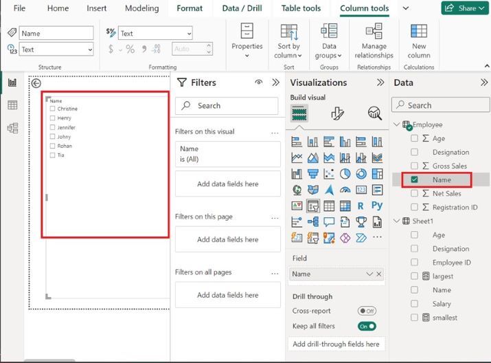 選擇Name列。選擇此列後,所有員工的姓名都將填充到切片器中,如下所示: