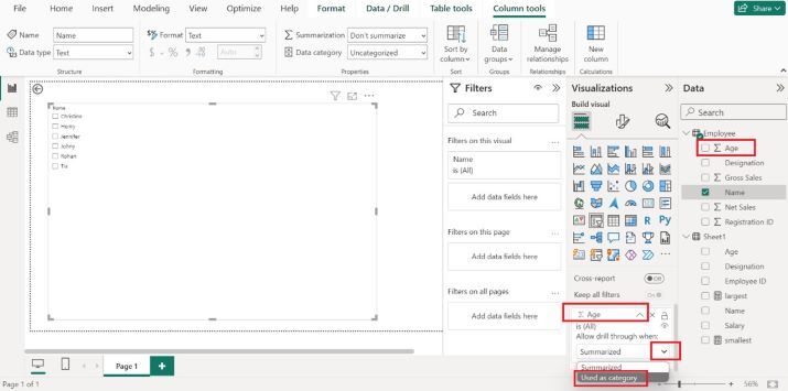將“Age”列拖動到“鑽取”文字框中,並選擇“用作類別”選項,如下所示: