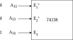 讓我們假設EPROM的起始地址分別為4000H、4400H……5C00H。4000H的二進位制表示為0 1 0 0 0 0 0 0 0 0 0 0 0 0 0 0。在這種情況下,當A15 A14 A13為0 1 0時,需要選擇74138,這可以透過以下連線實現: