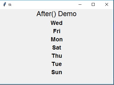 import random from tkinter import * base = Tk() a = Label(base, text="After() Demo") a.pack() contrive = Frame(base, width=450, height=500) contrive.pack() words = ['Mon', 'Tue', 'Wed', 'Thu', 'Fri','Sat','Sun'] #Display words randomly one after the other. def display_weekday(): if not words: return rand = random.choice(words) character_frame = Label(contrive, text=rand) character_frame.pack() contrive.after(500,display_weekday) words.remove(rand) base.after(0, display_weekday) base.mainloop()