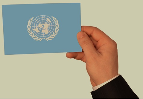 描述 - 聯合國官方標誌,白色,位於淺藍色背景的中心。
