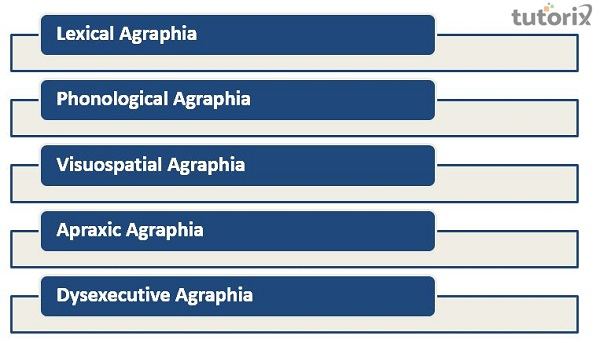 視覺空間性失寫症 - 視覺空間性失寫症患者可能難以保持書寫水平。他們可能會錯誤地組合單詞的組成部分。或者,他們可能會將書寫限制在一頁的四分之一處。患有這種失寫症的人在書寫時偶爾會漏掉單詞中的字母或在某些字母上新增筆畫。大腦的右半球與視覺空間性失寫症有關。