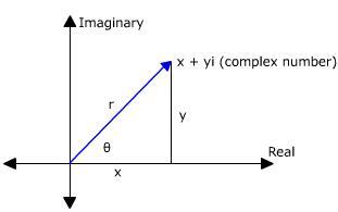 這裡,縱軸表示虛軸(想象的),而橫軸表示實軸。計算 r 以確定座標的實部和虛部。r 是向量的長度,θ 是與實軸形成的角度。