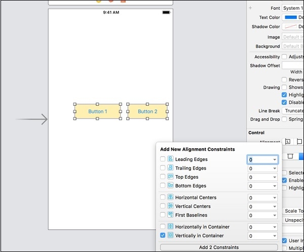 步驟 3:選擇這兩個按鈕,並使用“新增新的對齊約束”選單將它們垂直對齊。