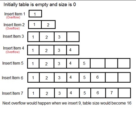 對於動態陣列,可以在給定的索引處以 O(1) 的時間插入項。但是,如果陣列中不存在該索引,則無法以固定時間執行任務。對於這種情況,它最初將陣列大小加倍,然後在索引存在的情況下插入元素。