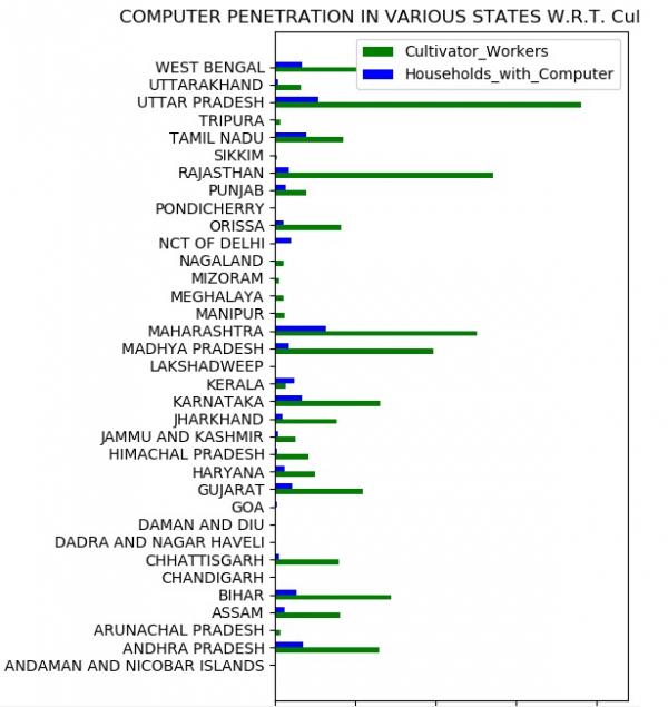 import pandas as pd import matplotlib.pyplot as plot from numpy import * datainput = pd.read_csv('E:\india-districts-census-2011.csv') z = datainput.groupby(by="State name") m = [] w = [] for k, g in z: t = 0 t1 = 0 for r in g.iterrows(): t += r[1][36] t1 += r[1][21] m.append((k, t)) w.append((k, t1)) mp= pd.DataFrame({ 'state': [x[0] for x in m], 'Households_with_Computer': [x[1] for x in m], 'Cultivator_Workers': [x[1] for x in w]}) d = arange(35) wi = 0.3 fig, f = plot.subplots() plot.xlim(0, 22000000) r1 = f.barh(d, mp['Cultivator_Workers'], wi, color='g', align='center') r2 = f.barh(d + wi, mp['Households_with_Computer'], wi, color='b', align='center') f.set_xlabel('Population') f.set_title('COMPUTER PENETRATION IN VARIOUS STATES W.R.T. Cultivator_Workers') f.set_yticks(d + wi / 2) f.set_yticklabels((x for x in mp['state'])) f.legend((r1[0], r2[0]), ('Cultivator_Workers', 'Households_with_Computer')) plot.rcParams.update({'font.size': 15}) plot.rcParams['figure.figsize'] = (15, 15) plot.show()