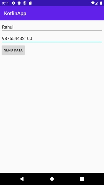 <?xml version="1.0" encoding="utf-8"?> <LinearLayout xmlns:android="http://schemas.android.com/apk/res/android" xmlns:tools="http://schemas.android.com/tools" android:layout_width="match_parent" android:layout_height="match_parent" android:layout_centerHorizontal="true" android:orientation="vertical" android:padding="4dp" tools:context=".MainActivity"> <EditText android:id="@+id/etName" android:layout_width="match_parent" android:layout_height="wrap_content" android:ems="10" android:hint="Enter a name" android:inputType="text" /> <EditText android:id="@+id/etPhone" android:layout_width="match_parent" android:layout_height="wrap_content" android:ems="10" android:hint="Enter a Phone number" android:inputType="number" /> <Button android:id="@+id/btnSend" android:layout_width="wrap_content" android:layout_height="wrap_content" android:text="Send data" /> </LinearLayout>