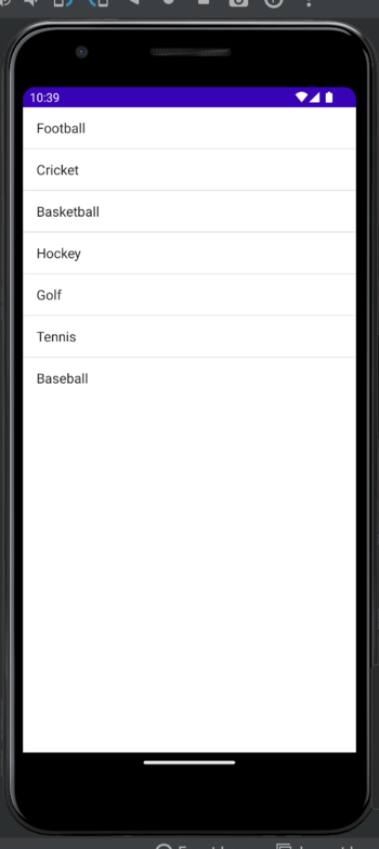 步驟 6 - 應用程式將自動在裝置或模擬器上開啟,您可以在其中看到包含運動專案名稱的 ListView。