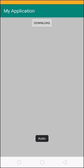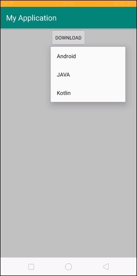 <?xml version = "1.0" encoding = "utf-8"?> <LinearLayout xmlns:android = "http://schemas.android.com/apk/res/android" xmlns:tools = "http://schemas.android.com/tools" android:id = "@+id/rootview" android:layout_width = "match_parent" android:layout_height = "match_parent" android:orientation = "vertical" android:background = "#c1c1c1" android:gravity = "center_horizontal" tools:context = ".MainActivity"> <Button android:id = "@+id/popup" android:text = "Download" android:layout_width = "wrap_content" android:layout_height = "wrap_content" /> </LinearLayout>