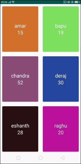 <?xml version = "1.0" encoding = "utf-8"?> <android.support.v7.widget.CardView xmlns:android="http://schemas.android.com/apk/res/android" xmlns:card_view = "http://schemas.android.com/apk/res-auto" android:layout_width = "match_parent" card_view:cardCornerRadius = "4dp" android:id =" @+id/card_view" android:layout_margin = "10dp" android:layout_height = "200dp"> <LinearLayout android:id = "@+id/parent" android:layout_gravity = "center" android:layout_width = "match_parent" android:orientation = "vertical" android:gravity = "center" android:layout_height="match_parent"> <TextView android:id = "@+id/name" android:layout_width = "wrap_content" android:gravity = "center" android:textSize = "25sp" android:textColor = "#FFF" android:layout_height = "wrap_content" /> <TextView android:id = "@+id/age" android:layout_width = "wrap_content" android:gravity = "center" android:textSize = "25sp" android:textColor = "#FFF" android:layout_height = "wrap_content" /> </LinearLayout> </android.support.v7.widget.CardView>