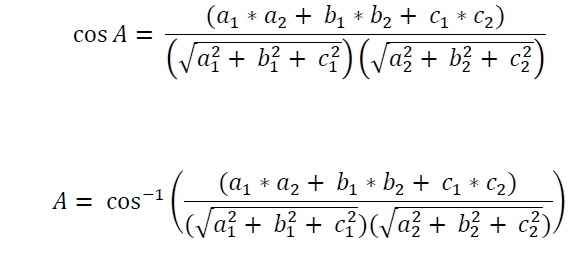 return (180.0 / 3.14159) * acos(nume/ (sqrt(deno1) * sqrt(deno2)));