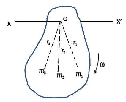 假設一個剛體包含 n 個粒子,這些粒子繞透過它的軸旋轉,角動量為 ω。每個粒子的質量為$\mathrm{m_1, m_2,....... m_n}$,它們到旋轉軸的距離為$\mathrm{r_1,r_2..................r_n}$。由於它是剛體,因此粒子的角動量與 ω 相同,但粒子的線速度不同,為$\mathrm{v_1,v_2..........................v_n}$。