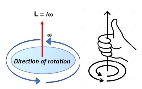 右手定則給出角動量的方向。如果除了拇指以外的四個手指彎曲並顯示物體的旋轉方向,則向上指的拇指表示角動量、角速度和扭矩的方向。