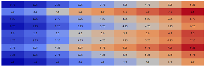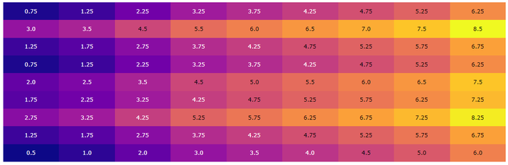 import plotly.figure_factory as ff import numpy as npp xt = [0,1,3,5,6,7,8,9,11] yt= [2,5,11,7,8,3,5,12,3] [Xx, Yy] = npp.meshgrid(xt, yt) Zz = (Xx / 2) + (Yy / 4) custom_col = [[0.2, 'pink'], [0.3, 'blue']] fig_plot = ff.create_annotated_heatmap(Zz, colorscale=custom_col) fig_plot.show()