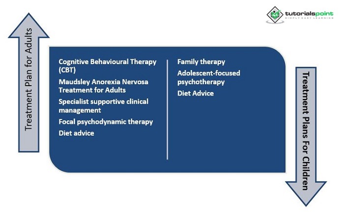 成人通常會接受認知行為療法 (CBT),該療法會根據患者的情況進行個性化調整;成人神經性厭食症療法 (MANTRA) 是另一種療法。它關注對個人而言重要的事情,並幫助他們按照自己的節奏改變行為。專業支援性臨床管理側重於導致該疾病的原因,並且個體會了解營養以及他們的飲食習慣如何導致他們的症狀。焦點精神動力學療法通常作為最後手段使用。他們試圖將飲食習慣與個人的思維過程和感受聯絡起來。飲食建議通常用作輔助方法。兒童通常會接受家庭治療;其中會請家庭成員參與治療。18歲以下的兒童也可能接受與成人類似的CBT。