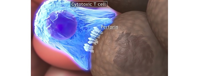 這些化學物質被稱為穿孔素和顆粒酶。穿孔素是實際上在附著到靶細胞時在質膜內形成孔狀結構的蛋白質。顆粒酶是透過穿孔素形成的這些孔進入並消化細胞導致細胞毒性的其他化學物質。