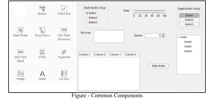 在MATLAB應用程式構建器中,常用元件包括那些響應互動的元件,例如按鈕、列表框、下拉選單、滑塊、樹形控制元件、標籤、座標軸、複選框、日期選擇器、用於文字和數字的編輯欄位、超連結、影像等。