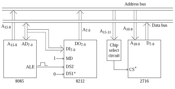 Intel 8212 作為低序地址鎖存器 − 在這裡,低序地址線路和資料線路被複用且可用作 AD7-0。方便將地址多次用作許多地址,並且會在不同的線路中分隔資料。舉例來說,如果我們在基於 8085 的系統中連線如 2716 這樣的晶片,則 2716 需要其地址引腳中的 11 位位地址,並且這裡有 8 位引腳專用於資料。現在將 AD7-0 引腳從 8085 連線到 2716 的 LS 8 地址引腳,地址將僅在一個完整機器週期中在一個時鐘週期內可用。因此,需要對地址和資料進行解複用