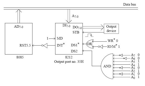 **Intel 8212 作為帶中斷的輸出埠** − 當任何輸出裝置想要執行受驅動的中斷資料傳輸時,都會在 STB 引腳上傳送一個正脈衝。