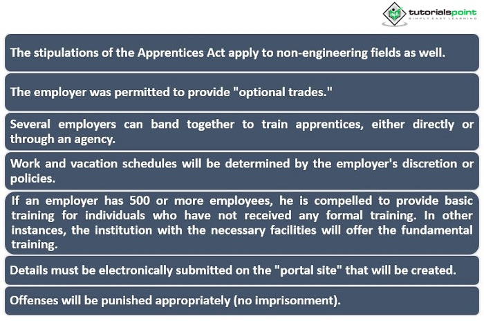 1961年《學徒法》的主要目標是滿足對熟練工人的日益增長的需求。《學徒法》的主要目標是為那些在其行業熟練的人員提供實踐培訓。擁有文憑和工程學位的候選人都可以利用這個專案。根據中央政府的一份宣告,該法的條款適用於所有領域。政府有望利用為學徒培訓提供的設施、場所和資源,並確保其培訓符合研究專案。為了從不斷發展的行業中恢復過來,企業和學生之間開始出現不同的問題。本法案應監督和監測學生如何為交流以及任何相關困難做好準備。