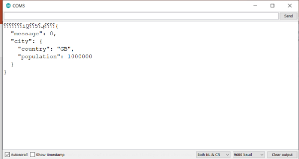 現在,當我們在序列埠監視器上列印此 JSON 文件時,輸出如下: