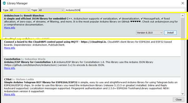 顧名思義,ArduinoJSON 庫有助於你在 Arduino 上處理 JSON 物件。要安裝它,請轉到庫管理器並搜尋 ArduinoJSON。安裝 Benoit Blanchon 開發的庫。