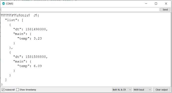 #include <ArduinoJson.h> void setup() { // Initialize serial port Serial.begin(9600); while (!Serial) continue; // The huge input: an extract from OpenWeatherMap response const __FlashStringHelper* input_json = F("{\"cod\":\"200\",\"message\":0,\"list [{\"dt\":1581498000,\"main\":{" "\"temp\":3.23,\"feels_like\":- 3.63,\"temp_min\":3.23,\"temp_max\":4.62," "\"pressure\":1014,\"sea_level\":1014,\"grnd_level\":1010,\"humidity\":" "58,\"temp_kf\":- 1.39},\"weather\":[{\"id\":800,\"main\":\"Clear\"," "\"description\":\"clear " "sky\",\"icon\":\"01d\"}],\"clouds\":{\"all\":0},\"wind\":{\"speed\":6." "19,\"deg\":266},\"sys\":{\"pod\":\"d\"},\"dt_txt\":\"2020-02-12 " "09:00:00\"},{\"dt\":1581508800,\"main\":{\"temp\":6.09,\"feels_like\":- " "1.07,\"temp_min\":6.09,\"temp_max\":7.13,\"pressure\":1015,\"sea_" "level\":1015,\"grnd_level\":1011,\"humidity\":48,\"temp_kf\":- 1.04}, "\"weather\":[{\"id\":800,\"main\":\"Clear\",\"description\":\"clear " "sky\",\"icon\":\"01d\"}],\"clouds\":{\"all\":9},\"wind\":{\"speed\":6." "64,\"deg\":268},\"sys\":{\"pod\":\"d\"},\"dt_txt\":\"2020-02-12 " "12:00:00\"}],\"city\":{\"id\":2643743,\"name\":\"London\",\"coord\":{" "\"lat\":51.5085,\"lon\":- 0.1257},\"country\":\"GB\",\"population\":" "1000000,\"timezone\":0,\"sunrise\":1581492085,\"sunset\":1581527294}}"); // The filter: it contains "true" for each value we want to keep StaticJsonDocument<200> filter; filter["list"][0]["dt"] = true; filter["list"][0]["main"]["temp"] = true; // Deserialize the document StaticJsonDocument<400> doc; deserializeJson(doc, input_json, DeserializationOption::Filter(filter)); // Print the result serializeJsonPretty(doc, Serial); } void loop() { // not used in this example }