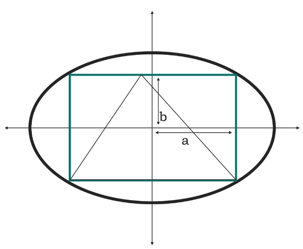 在這裡,我們將看內切於一個矩形且該圓內切於一個橢圓的三角形的面積。長軸和短軸的一半分別為“a”和“b”。假設矩形的長度為“l”,寬度為“h”
