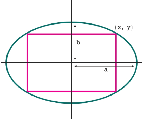 a 和 b 是橢圓長軸和短軸的一半。矩形的右上角是 (x, y)。因此,面積是