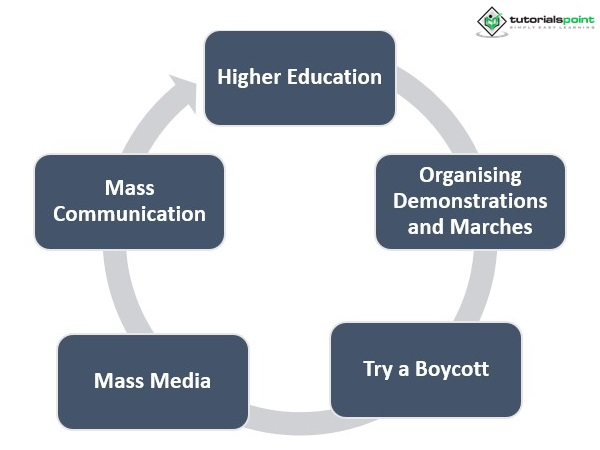 這包括抵制抵制者認為在道德上令人反感地行事著的公司、城市、州或國家,或者靜坐,即個人佔據一個場所,例如制定了該團體正在抗議的政策的官員的辦公室。