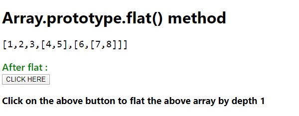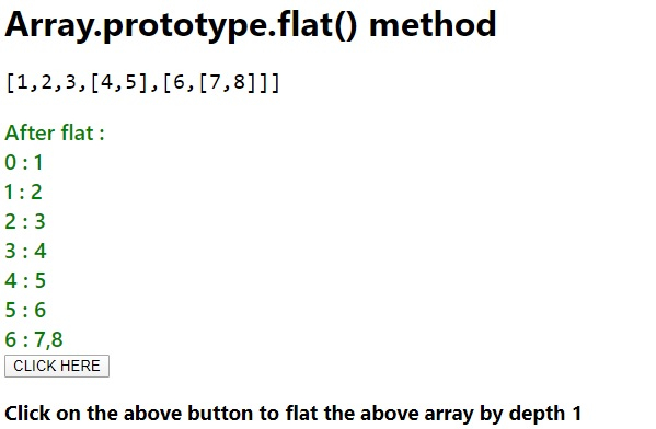 <!DOCTYPE html> <html lang="en"> <head> <meta charset="UTF-8" /> <meta name="viewport" content="width=device-width, initial-scale=1.0" /> <title>Document</title> <style> body { font-family: "Segoe UI", Tahoma, Geneva, Verdana, sans-serif; } .result,.sample { font-size: 20px; font-weight: 500; } </style> </head> <body> <h1>Array.prototype.flat() method</h1> <div class="sample"&g;<pre>[1,2,3,[4,5],[6,[7,8]]]</pre></div> <div style="color: green;" class="result">After flat : <br></div> <button class="Btn">CLICK HERE</button> <h3>Click on the above button to flat the above array by depth 1</h3> <script> let resEle = document.querySelector(".result"); let sampleEle = document.querySelector(".sample"); let arr = [1,2,3,[4,5],[6,[7,8]]]; document.querySelector(".Btn").addEventListener("click", () => { let store = arr.flat(1); store.forEach((item,index) => { resEle.innerHTML += index + ' : ' + item + '<br>'; }); }); </script> </body> </html>