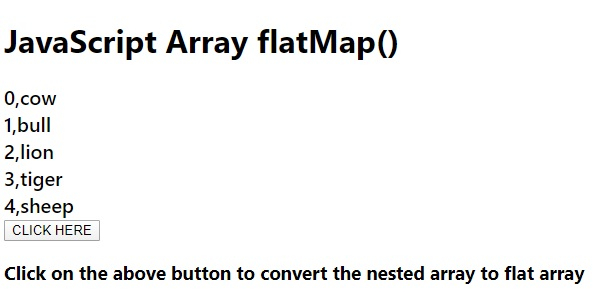 <!DOCTYPE html> <html lang="en"> <head> <meta charset="UTF-8" /> <meta name="viewport" content="width=device-width, initial-scale=1.0" /> <title>Document</title> <style> body { font-family: "Segoe UI", Tahoma, Geneva, Verdana, sans-serif; } .sample { font-size: 20px; font-weight: 500; } </style> </head> <body> <h1>JavaScript Array flatMap()</h1> <div class="sample"></div> <button class="Btn">CLICK HERE</button> <h3>Click on the above button to convert the nested array to flat array</h3> <script> let fillEle = document.querySelector(".sample"); let arr = ["cow", ["bull", "lion", "tiger"], "sheep"]; for (x of arr.entries()) { fillEle.innerHTML += x + "<br>"; } var entries = arr.entries(); document.querySelector(".Btn").addEventListener("click", () => { arr = arr.flatMap((x) => x); fillEle.innerHTML = ""; for (x of arr.entries()) { fillEle.innerHTML += x + "<br>"; } }); </script> </body> </html>