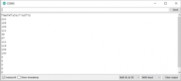 這將把陣列的第一個元素設定為“H”,下一個元素設定為“e”,依此類推。“Hello World”之後的元素都將設定為 0。你可以透過以下程式驗證這一點:
