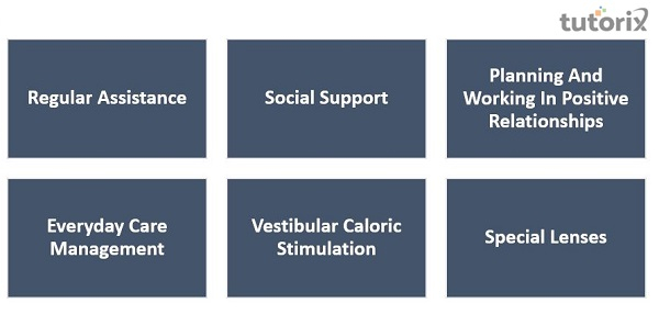 家庭和朋友在房屋、計劃和工作中的定期幫助,並在積極的關係中工作,將有助於長期的日常護理管理。用冷水(60 毫升,20°C)灌溉對側外耳道 1 分鐘被稱為前庭熱量刺激。患者必須佩戴特殊的鏡片,導致整個視野偏離病灶側。可以使用鏡子研究間接視覺輸入對身體形象的影響。