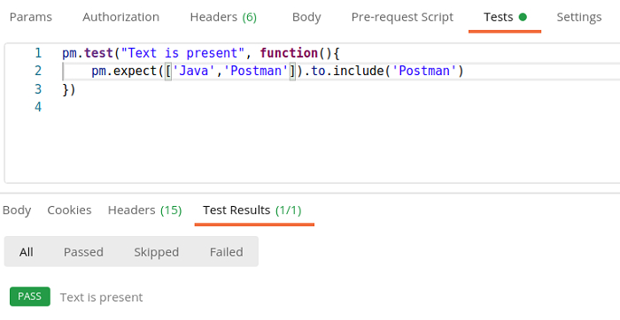 pm.expect(['Java', 'Postman']).to.include('Postman')