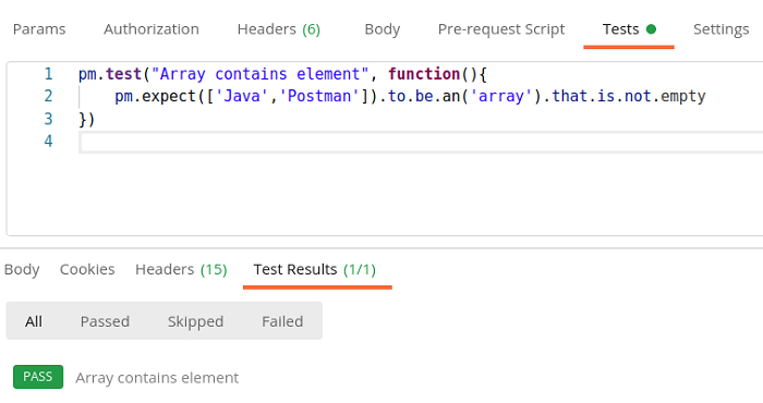 pm.expect(['Java', 'Postman']).to.be.an('array').that.is.not .empty