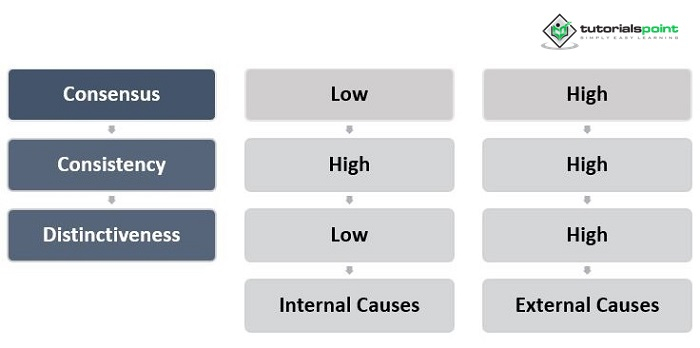 性格歸因或情境歸因更有可能取決於每一類資訊的單獨存在或不存在。當共識資訊存在時(即,當其他每個人都像目標個體一樣行動時),它表明存在情境原因。相反,當它不存在時,它表明存在性格原因。當一致性資訊存在時,它表明存在性格原因;當它不存在時,它表明存在情境原因(目標個體始終表現出相似的行為)。獨特性資訊缺失(目標人在各種情境下行為一致)暗示性格原因,而獨特性資訊的存在則暗示情境原因。