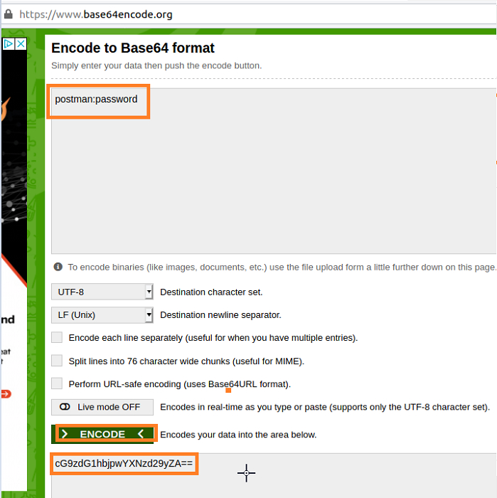 接下來,為了以編碼格式新增憑據,我們將藉助一個第三方應用程式,連結為− https://www.base64encode.org/。以postman-password的格式在編輯框中輸入使用者名稱(postman)和密碼(password),如下圖所示。然後點選“Encode”。