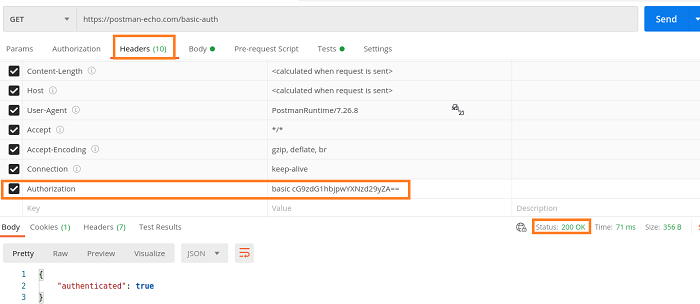 我們將在頁面底部獲得一個編碼文字cG9zdG1hbjpwYXNzd29yZA==。這必須以basic cG9zdG1hbjpwYXNzd29yZA==的格式新增到Postman中Authorization鍵的值中。然後傳送API請求。