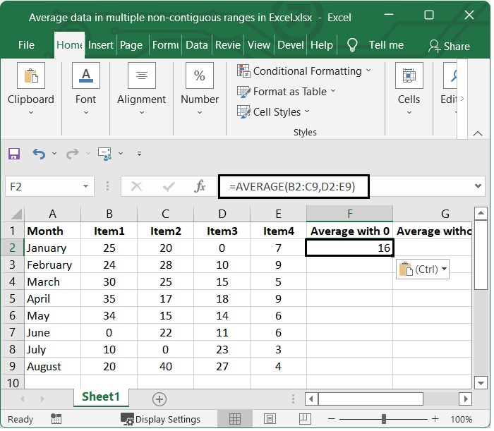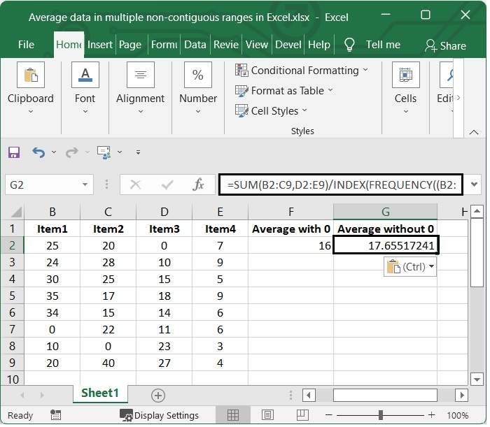 現在,讓我們看看如何計算不連續單元格中數字的平均值,但不包括零。