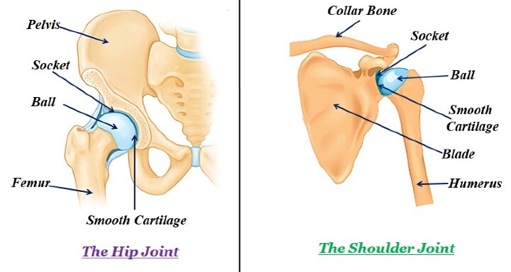一塊骨骼的圓形表面是圓形或球形的;因此被稱為“球”;它連線到另一塊骨骼的凹腔,通常被稱為“窩”。因此被稱為“球窩關節”。該關節充滿液體,起到緩衝作用,有助於潤滑,促進最佳運動和穩定性。韌帶和肌腱維持這些關節。