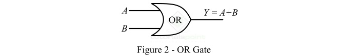 因此,或門是一種數字邏輯裝置,即使其其中一個輸入為 1,其輸出也為 1。因此,或門也可以稱為任意或所有門。用於表示或運算的符號是“+”。因此,或門的布林函式為: