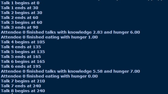 我們在上面嘗試複製會議廳的場景,其中有隨機數量的演講者,每場會議的演講次數為4次,每次演講時長為40分鐘,休息時長為30分鐘。