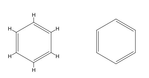 苯的結構表示通常是一個六碳環,帶有三個雙鍵。每個連線兩個其他原子的連線處表示一個碳原子。在苯的化學分子中,這些原子是氫。由於雙鍵被單鍵隔開,我們可以確定該結構包含共軛雙鍵。另一種表示六個π電子的方法是在六邊形內畫一個圓圈。這些影像中的每一個都具有正面和負面特徵。