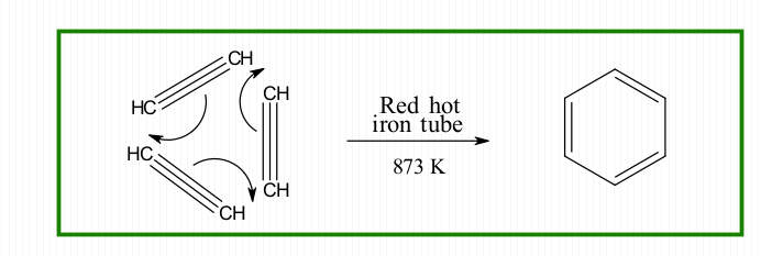 環狀聚合是用於由乙炔製備苯的方法之一。在這個過程中,乙炔透過 873 K 的紅熱鐵管。然後,乙炔分子進行環狀聚合生成苯。