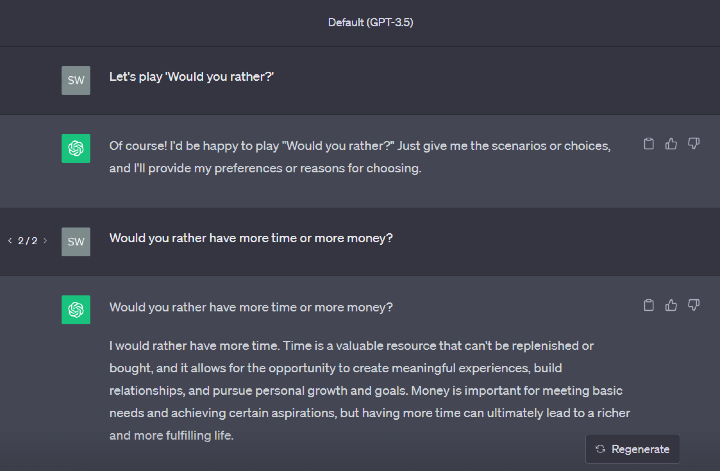 您可以使用 ChatGPT 玩有趣的“你寧願”遊戲,您提供兩個選項,機器人會回覆最有價值的選擇。 “讓我們玩‘你寧願’吧?”可以作為提示。您必須決定我給您的兩個選項中哪個最好。