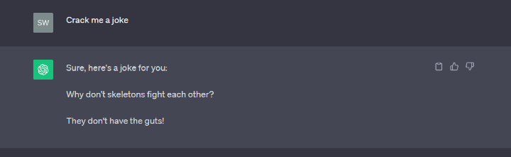如果您感到無聊並且想轉移注意力,可以要求機器人講一些笑話。 “給我講個笑話”是一個可能的提示。