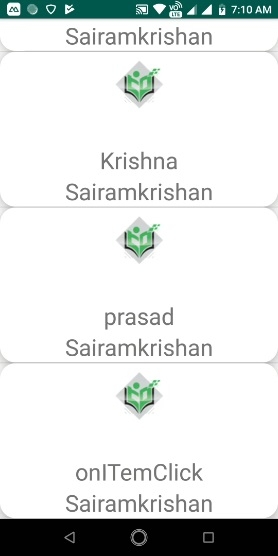 <?xml version = "1.0" encoding = "utf-8"?> <android.support.v7.widget.CardView xmlns:android = "http://schemas.android.com/apk/res/android" xmlns:app = "http://schemas.android.com/apk/res-auto" xmlns:tools = "http://schemas.android.com/tools" android:layout_width = "match_parent" android:layout_height = "wrap_content" app:cardElevation = "10dp" app:cardCornerRadius = "20dp" tools:context = ".MainActivity"> <LinearLayout android:layout_width = "match_parent" android:layout_height = "wrap_content" android:gravity = "center" android:orientation = "vertical"> <ImageView android:id = "@+id/imageView2" android:layout_width = "wrap_content" android:layout_height = "wrap_content" android:src = "@drawable/logo" /> <TextView android:id = "@+id/title" android:layout_width = "match_parent" android:layout_height = "wrap_content" android:gravity = "center" android:textSize = "30sp" /> <TextView android:id = "@+id/textview2" android:layout_width = "match_parent" android:layout_height = "wrap_content" android:gravity = "center" android:text = "Sairamkrishan" android:textSize = "30sp" /> </LinearLayout> </android.support.v7.widget.CardView>