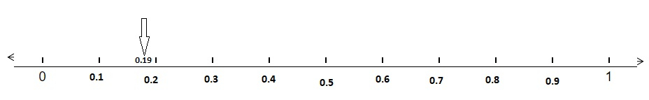 0.19 在數軸上位於 0.1 和 0.2 的十分位數之間。