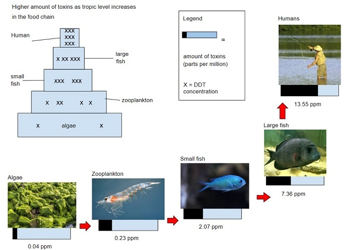 食物鏈中較高的蛤類和魚類會吃掉這些生物。因此,DDT 現在在其體內積累。此外,蛤類和魚類體內 DDT 的濃度也增加了。研究發現,魚類和蛤類體內 DDT 的濃度是水生生物的 10 倍。